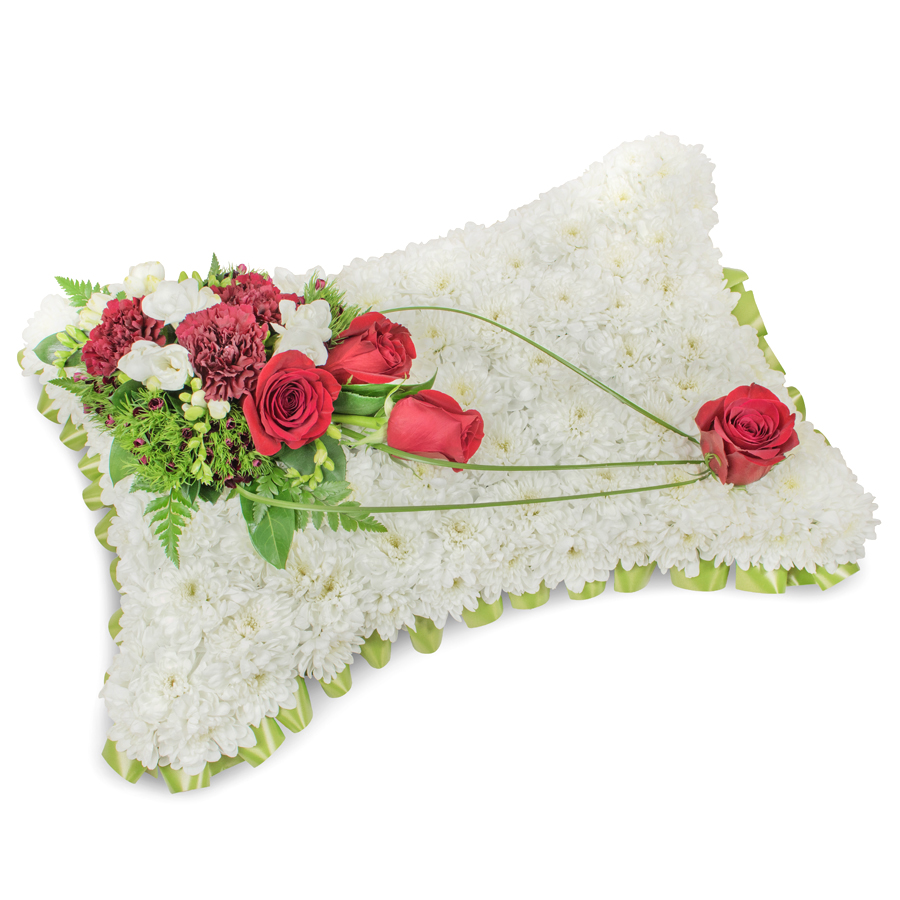 Show your heartfelt sympathy with our sophisticated floral arrangement, designed to offer comfort and beauty. This exquisite bouquet includes white chrysanthemums, red roses, white freesias, dark red carnations, dianthus, and bear grass, each hand-picked to ensure the highest quality and freshness.